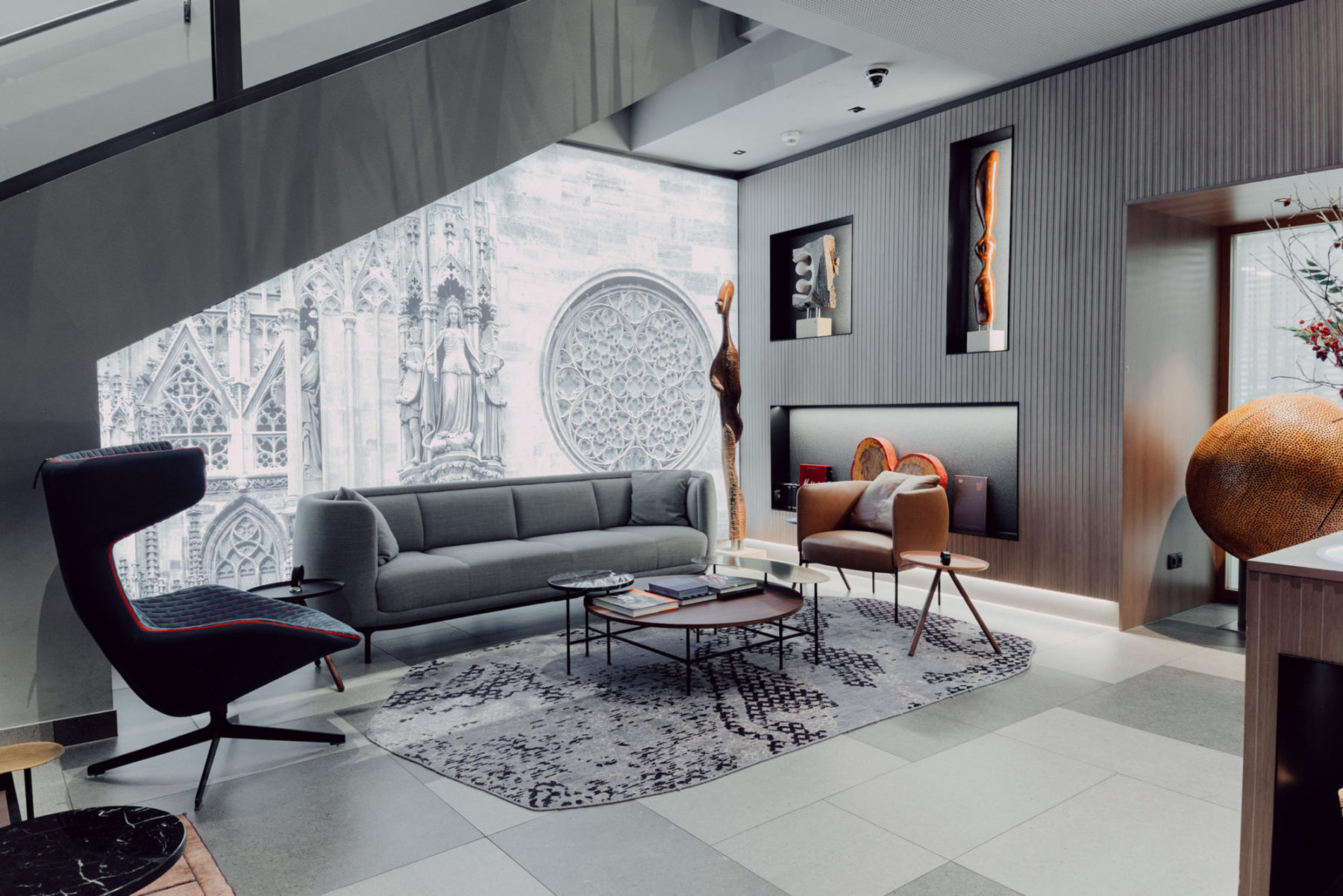 El Hotel Am Stephansplatz escogió el color antracita y white de este porcelánico efecto piedra, en acabado natural y rigato. Los formatos que se pueden ver en este proyecto hotelero son 45X90 / 15X90 / 90X90.