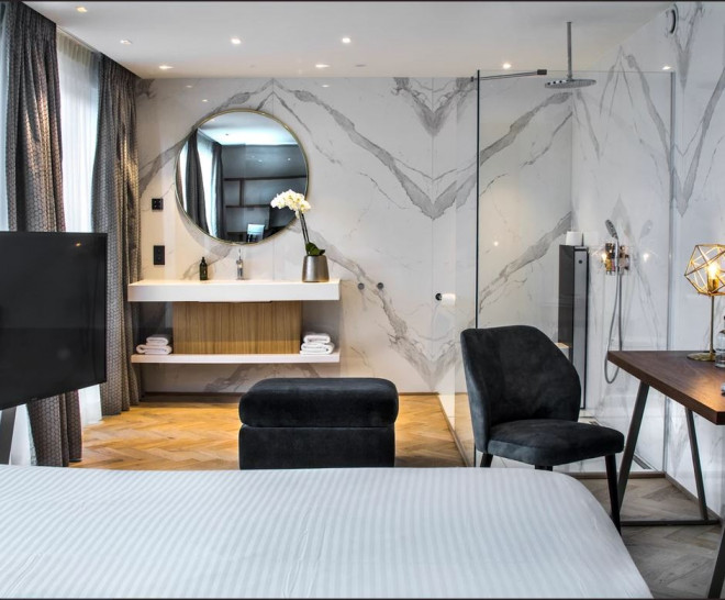 En el corazón de Bruselas, cerca del Palacio Real de Bruselas y de la emblemática plaza Grand Place, el Harmon es un lugar ideal para descansar o trabajar en las mejores condiciones. El diseño del edificio, original y relajante, ofrece la calma necesaria para la concentración y la inspiración. El Harmon es una mansión privada que dispone de 27 habitaciones, algunas de las cuales tienen una vista impresionante de la ciudad. Para estar en consonancia con su diseño cálido, elegante y acogedor, se decidió elegir las colecciones Marble y Statuario de Apavisa, dos espectaculares porcelánicos con efecto de mármol que otorgan una increíble sofisticación a las estancias.