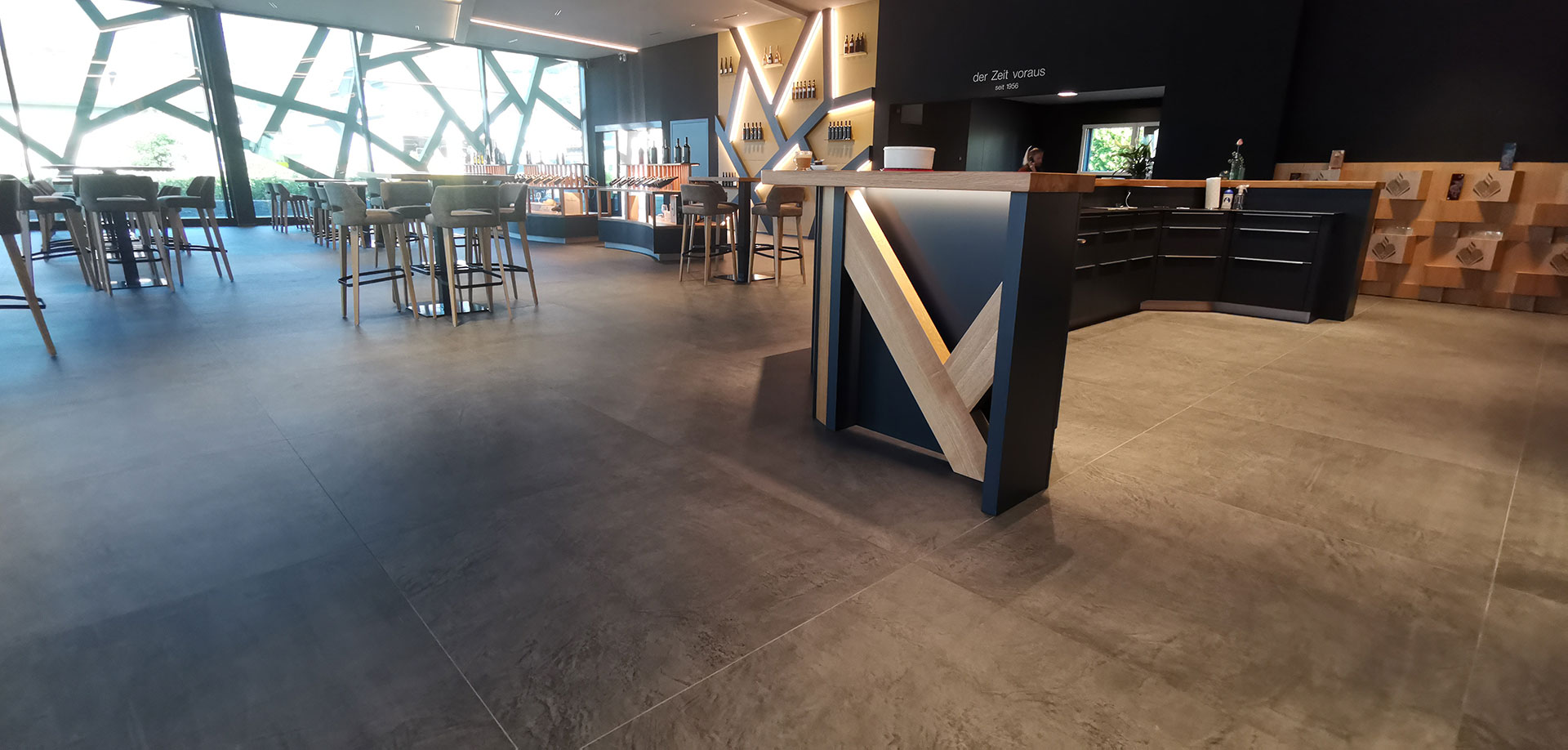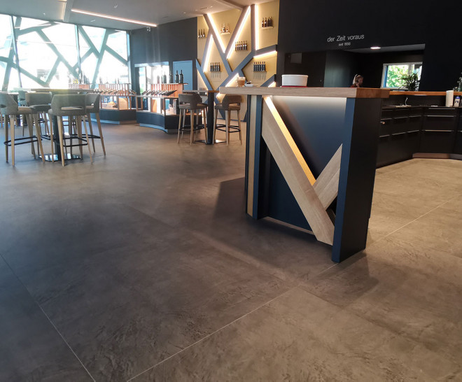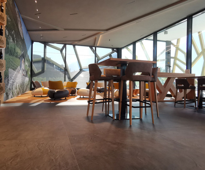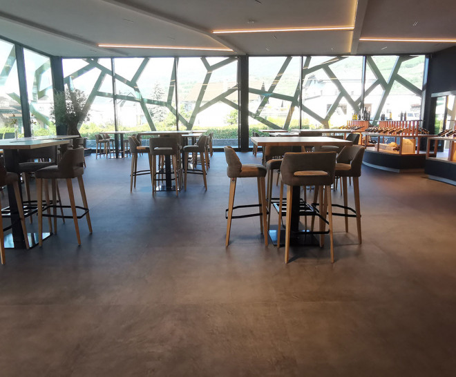Para decorar el pavimento se escogió la colección Equinox de la serie Slabs de Apavisa, un azulejo con un acabado que representa el microcemento, con formato de 120x120, color antracita y acabado natural. Idónea para grandes espacios tanto residenciales como contract, con mucha personalidad y con un aire metropolitano.